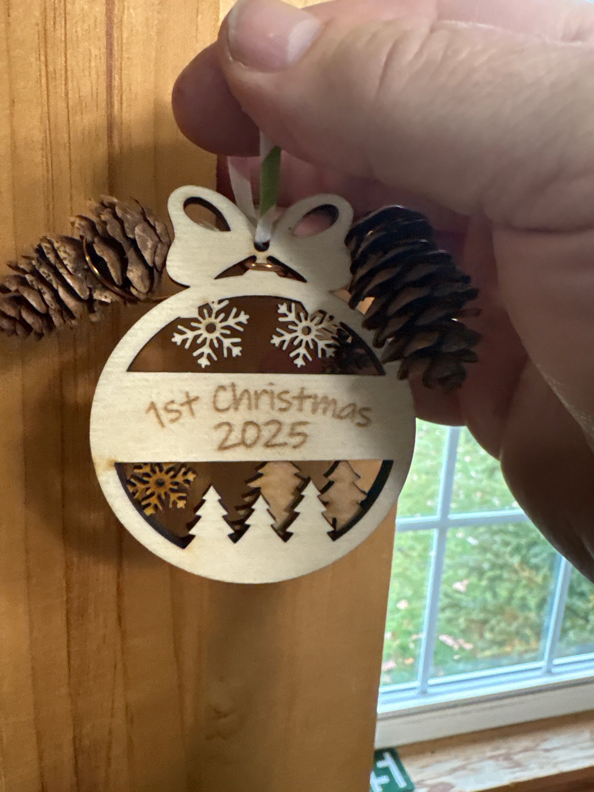 Get ahead of the game and make your first Christmas of 2025 one to remCelebrate your 1st Christmas 2025 with this unique wooden ornament. Hand crafted with real Maine spruce cones, each 2 1/2 inch ornament is one-of-a-kind. Only available this year--don't miss out!ember with our hand-crafted wooden spruce cones! With real Maine spruce and a 2 1/2 inch size, this unique decoration will add a touch of whimsy and charm to your holiday season.
