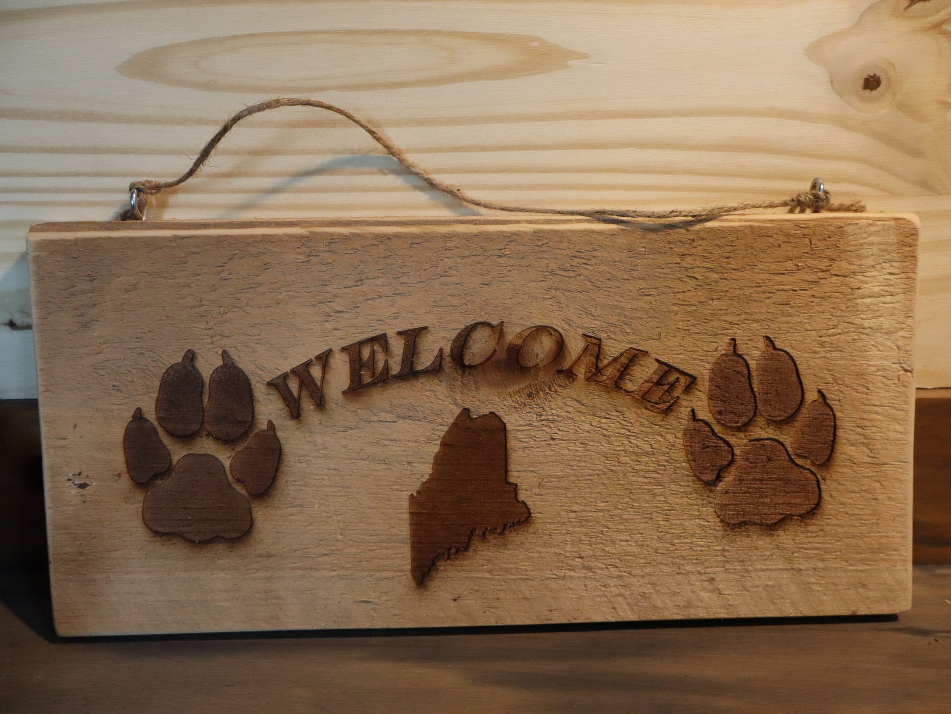 This handcrafted Dog Paw Welcome Sign features a laser-engraved silhouette of the State of Maine alongside a charming dog paw design. Made from rough-sawed wood and equipped with eye hooks for easy hanging, this 14" x 8" sign combines rustic appeal with expert craftsmanship. Perfect for adding a warm, personalized touch to your home or cabin, it celebrates Maine’s spirit and your love for dogs with durable, artisanal quality.