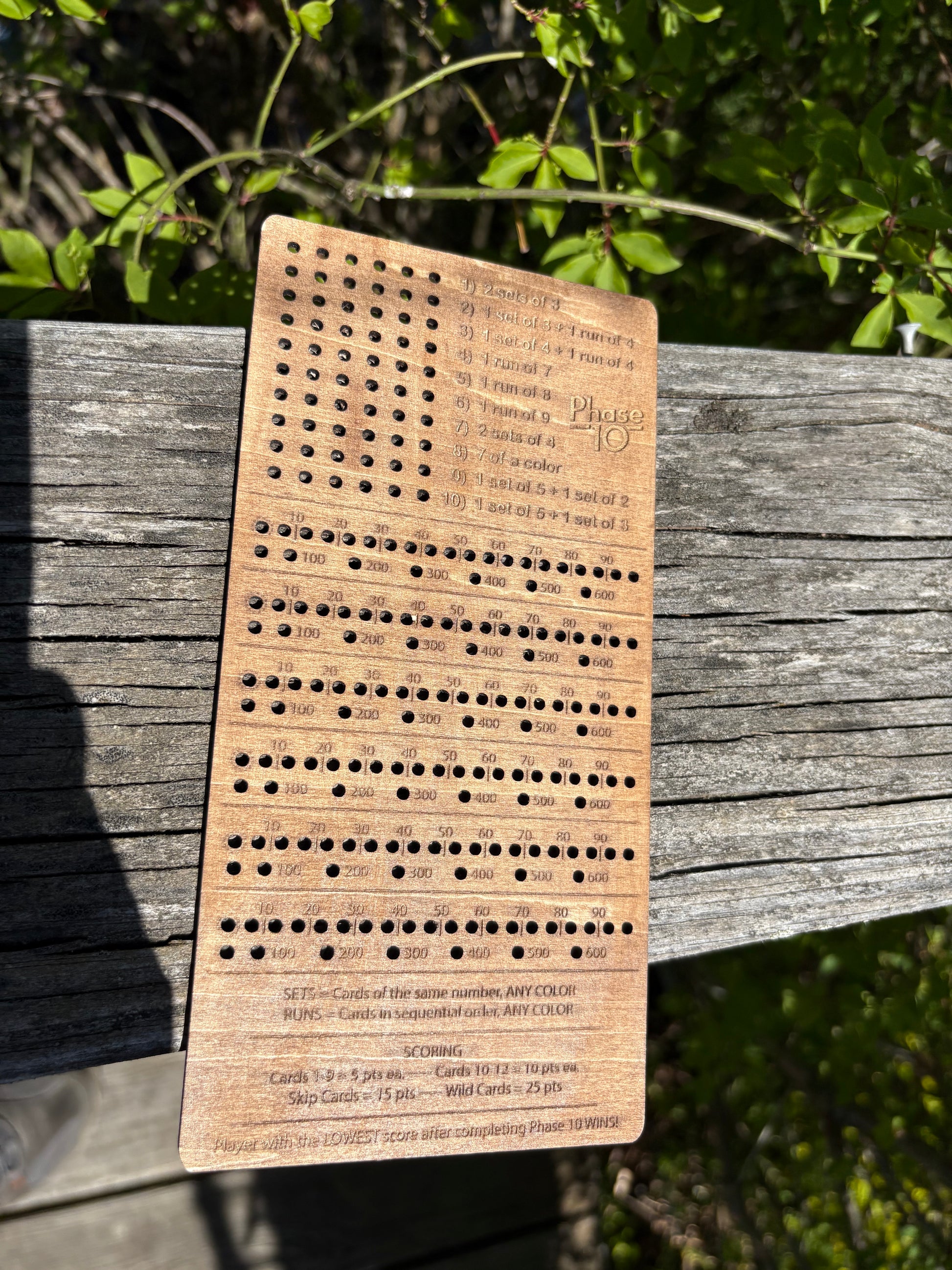 This expertly crafted Phase 10 score card measures 4" x 7" and is laser engraved for precision and durability. Handmade from wood, it includes 18 pegs for accurate score tracking. A distinctive engraved white tail deer adorns the top right corner, adding a unique touch. Natural color variations in the wood ensure each piece is one of a kind, blending functionality with artisanal craftsmanship.